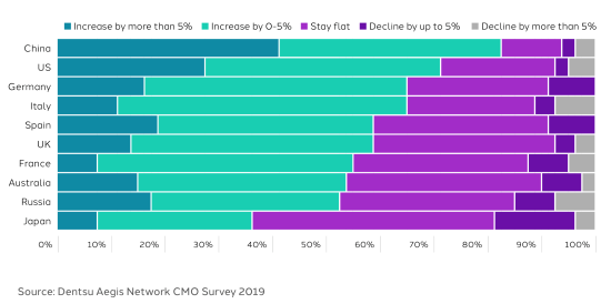At the global level, the outlook for the next 12 months is mixed with 41% of CMOs reporting budgets as flat or declining, despite growing revenues (64% of respondents reported revenue growth over the same period). China stands out as a rare exception here, with only 17% of CMOs reporting budget as flat or declining (against 87% of same respondents reporting revenue growth for their businesses).