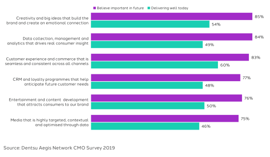 Across a spectrum of marketing capabilities, CMOs were asked what they believe to be important to future success, versus their current ability to execute. The data shows a significant gap emerging between the two: