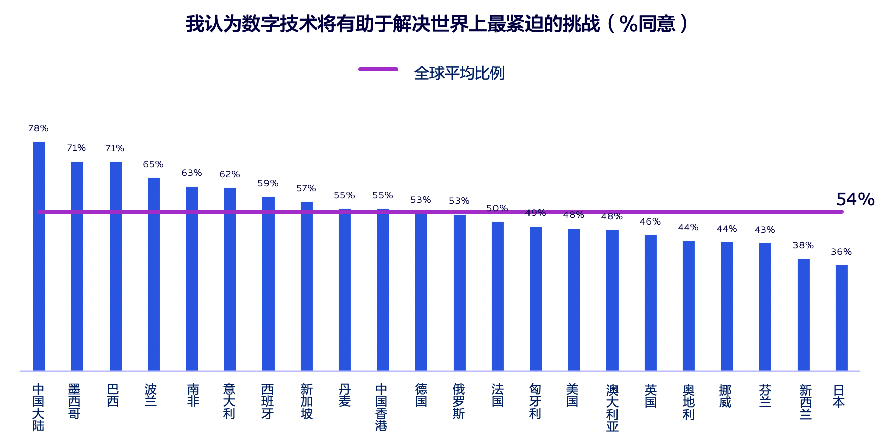 - 中国以积极乐观的态度引领世界,大多数中国受访者(78%)认为数字技术能够解决当今世界最紧迫的挑战,同意这一观点的比例比全球平均水平高出24%。