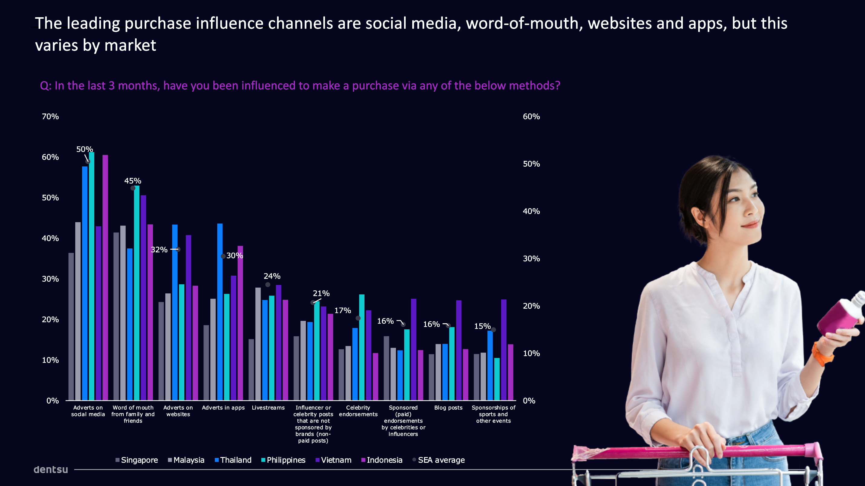As depicted in the chart, a plethora of channels, platforms, or sources influence the purchase decision. The leading channels of influence include social media, word-of-mouth, websites, and apps, but this varies by market. What this means, specifically for CPG brands in internet mature countries such as Indonesia is that it is increasingly important to include social media advertising, live-streaming, and influencer/KOLs as part of your marketing mix.