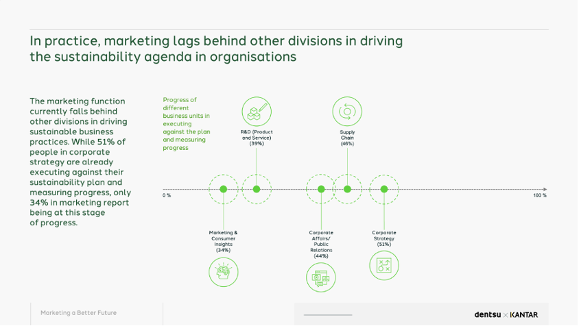 Dentsu and Kantar's special report on corporate sustainability has revealed that Marketing and Insights department lag behind other business divisions when it comes to executing and measuring progress on their sustainability objectives.