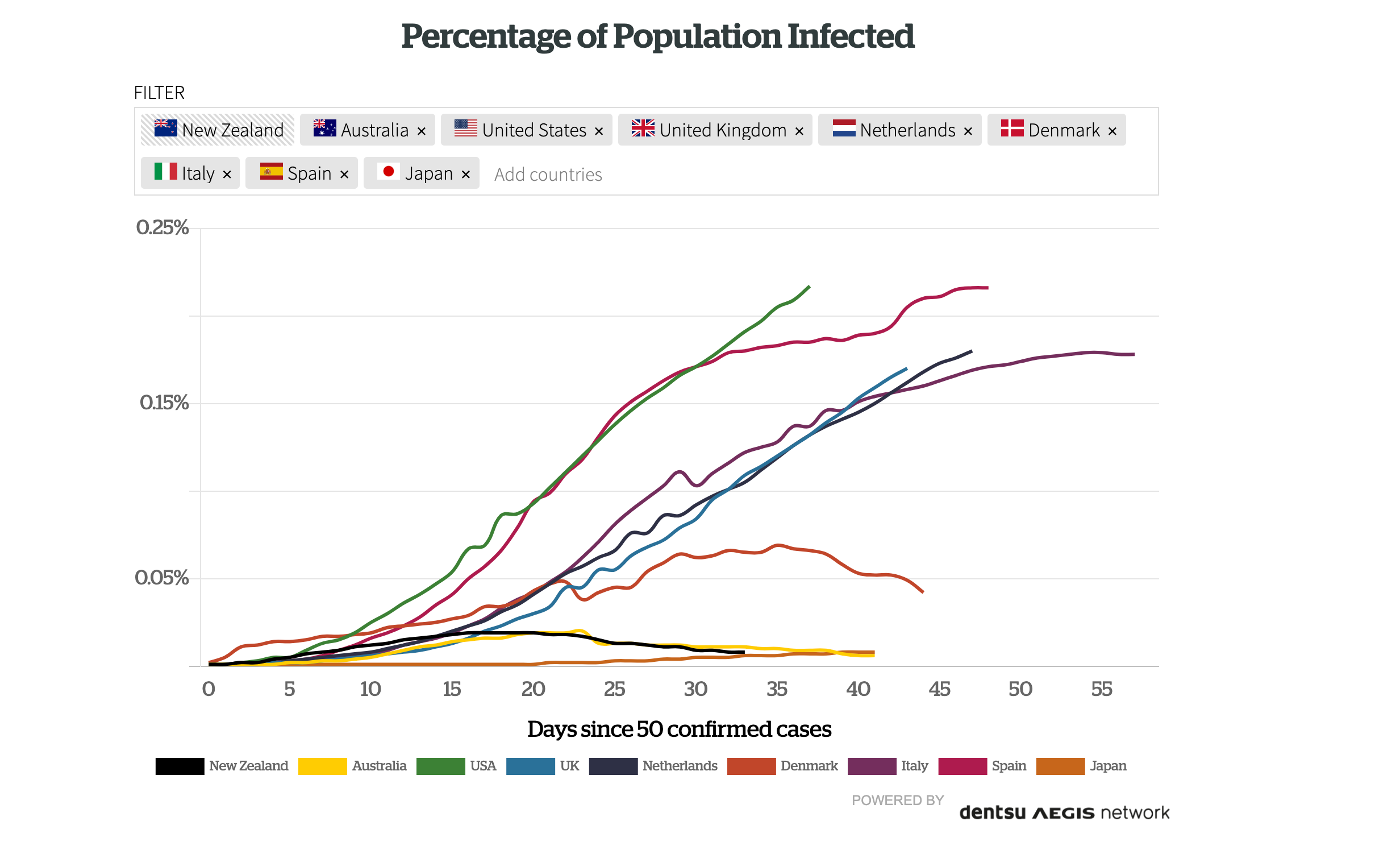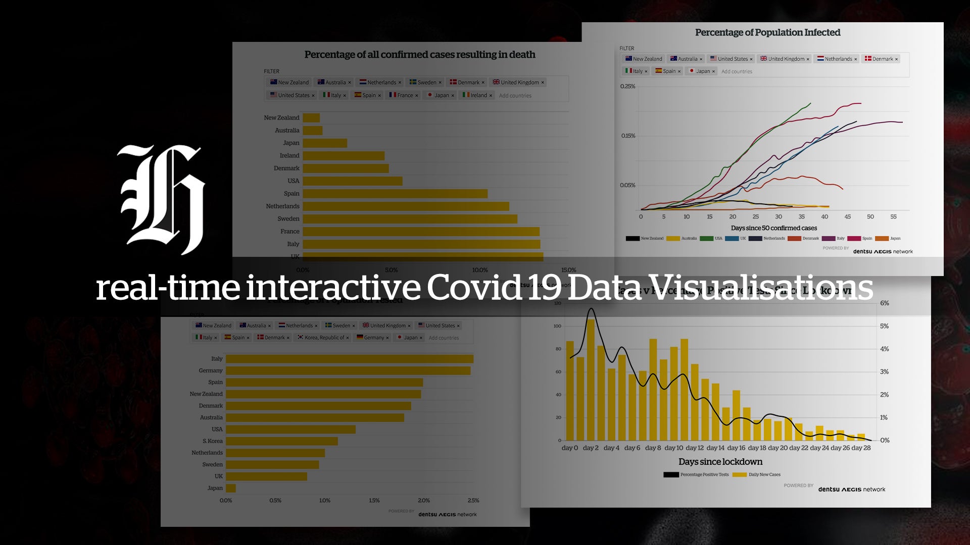Dentsu Aegis Network are powering interactive, real-time Covid-19 charts and graphs within NZ Herald articles. Based on a live, global database assembled from multiple sources, the charts enable real-time comparisons between New Zealand and hundreds of countries around the world. Metrics include percentage of population infected & tested, percentage of deaths and live vs recovered cases.