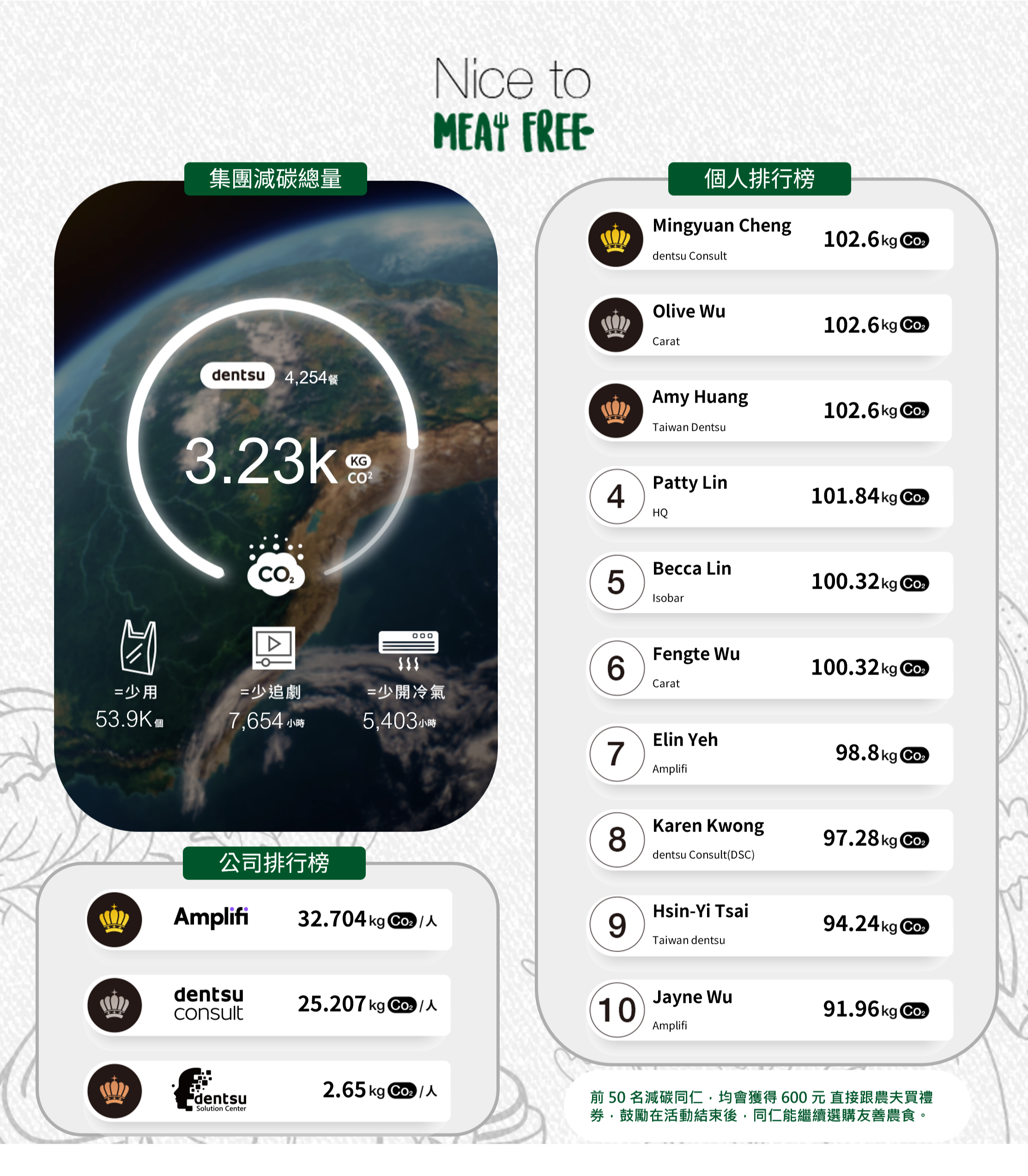 Within the organization, Dentsu promotes sustainability awareness through internal sustainability salons and the “Nice to Meat Free” initiative, which encourages employees to choose at least one vegan-meal per day. In a single month, the initiative delivered 30,000 vegetarian meals, reducing more than 25,000 kilograms of CO₂ emissions, making it a leading successful case to stress how corporate behavior change can support low-carbon living.