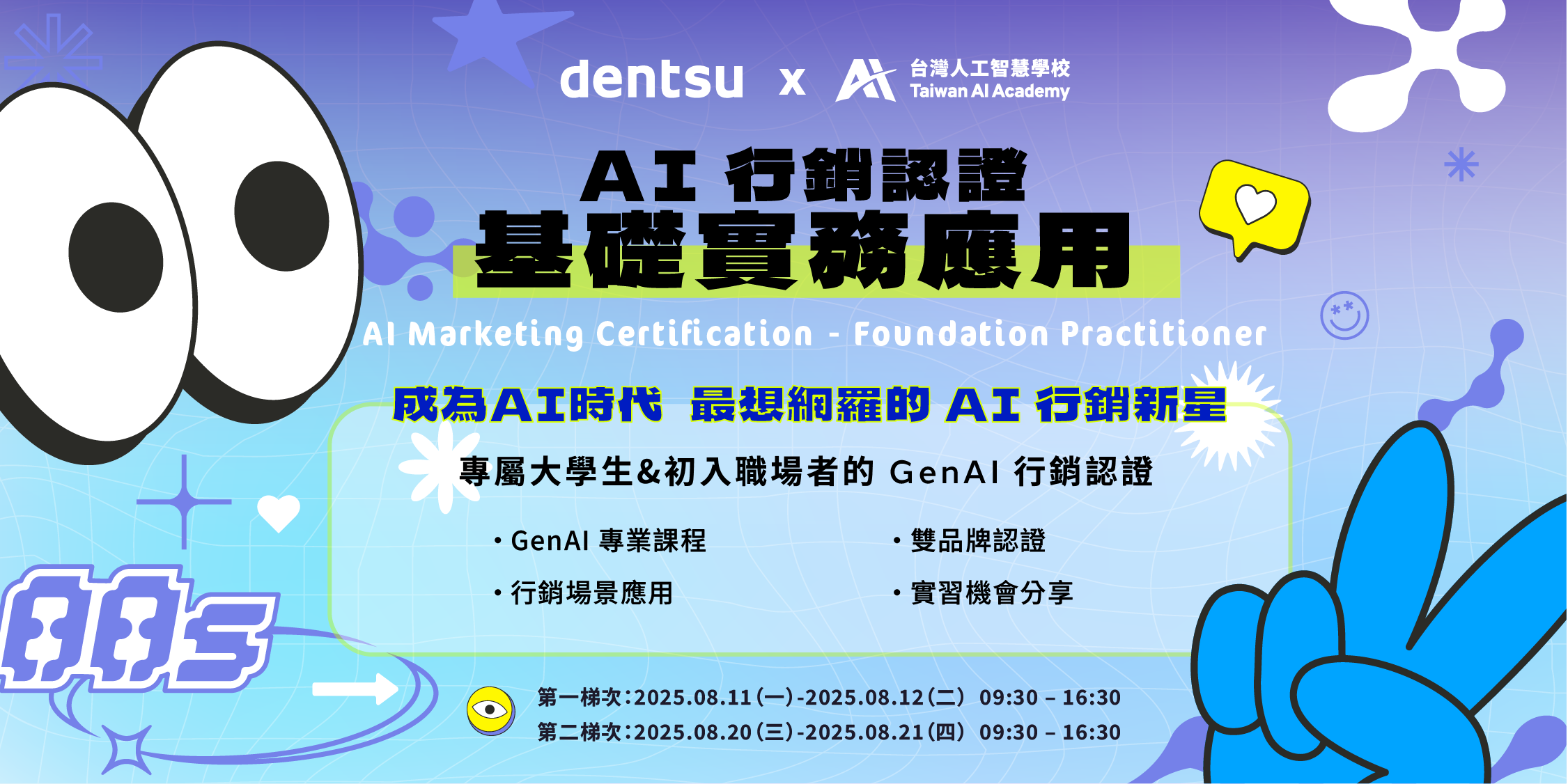 為協助年輕世代迎向生成式 AI 浪潮,電通行銷傳播集團與台灣人工智慧學校(AIA),宣布合作推出「AI 行銷認證:基礎實務應用」(AIMCFP) 課程,首梯次鎖定大專院校學生,將於 2025 年 8 月 11 日正式開課。