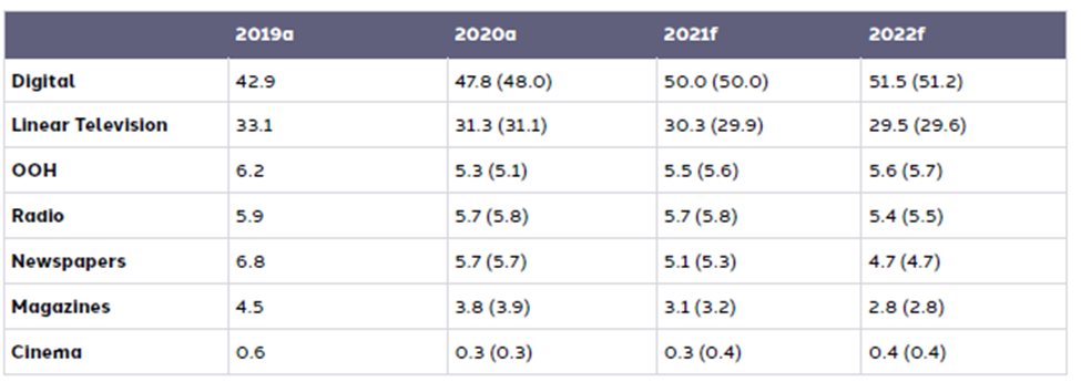 • Digital continues to drive recovery, returning to double digit growth. It will represent 50.0% share of global spend this year