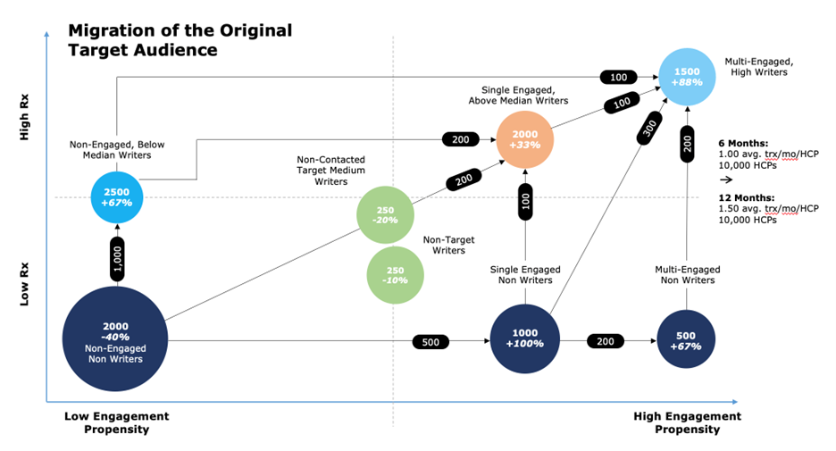 In order to optimize sales and marketing spend, it is imperative that a strategic focus on delivering value to HCPs is meticulously integrated. It is paramount to acknowledge that various HCPs exhibit diverse needs, require varying levels of support, and engage with the brand through distinct avenues and most importantly, are influenced by a broad selection of variables ranging from NPP and field force activity through to social media and their peers and clinical support team. This sophisticated approach to segmentation serves as a catalyst for obtaining profound insights into individual engagement throughout the entirety of the HCP journey, ranging from initial awareness to trial to retention to potentially defection.