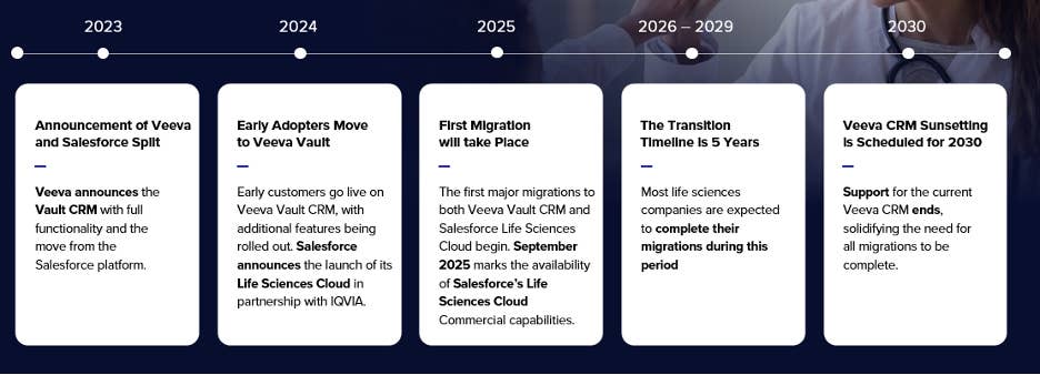 Here’s the critical and confusing decision: move to Veeva’s new Vault CRM, stay with Salesforce as they figure out a life sciences-tailored solution, or switch to something completely new like Adobe or IQVIA? The timeline below outlines the road ahead.