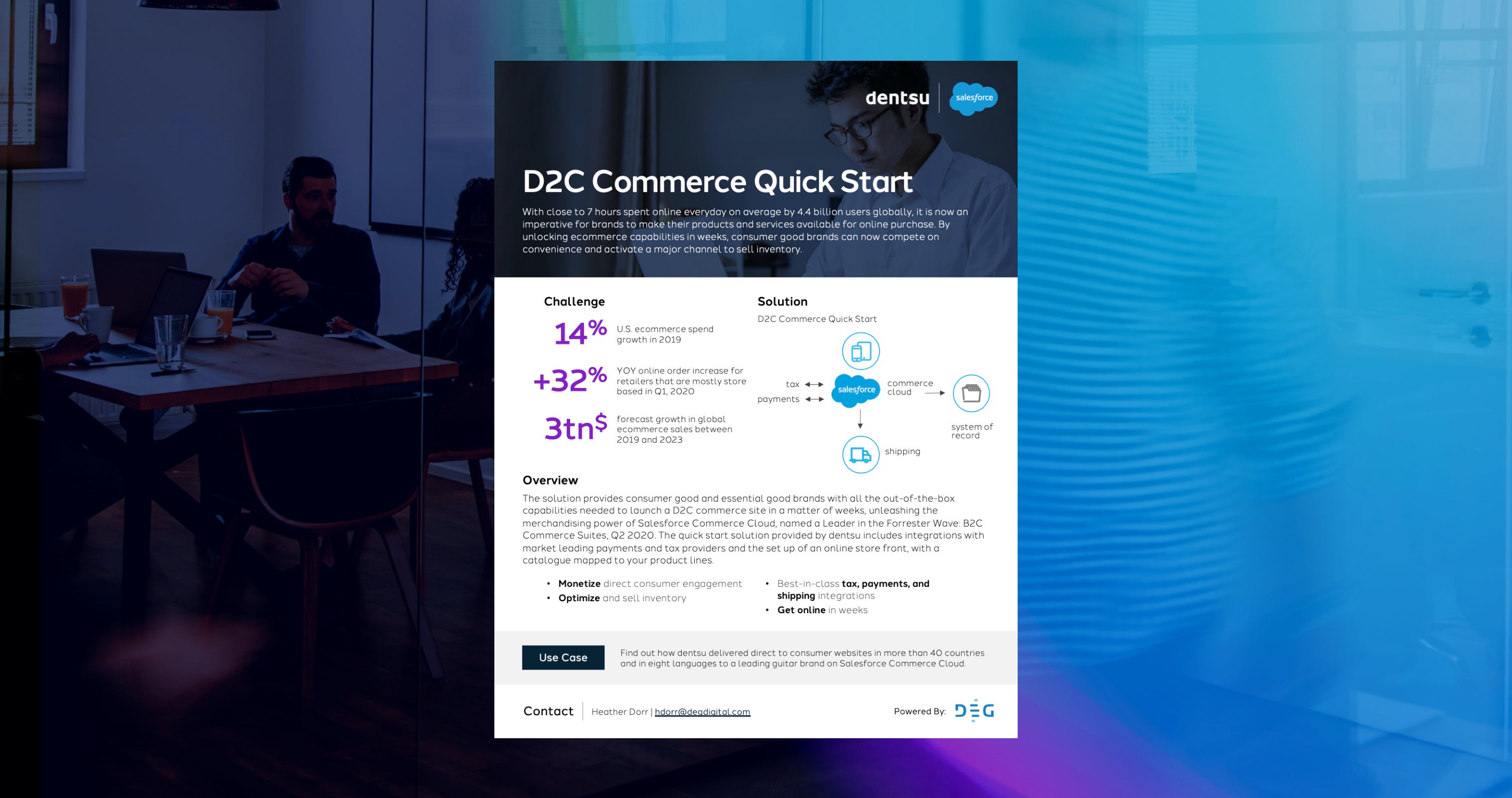 This Quick Start Solution allows your brand to stand up a direct to consumer online shopping presence on Salesforce Commerce Cloud in weeks.